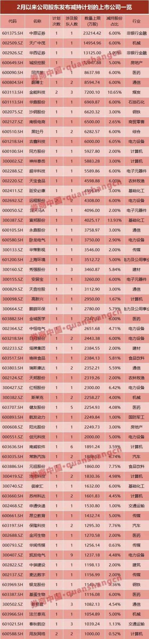 据券商中国记者统计,2月1日至27日,两市共有148家上市公司发布了158份减持计划,而与之形成鲜明对比的是,在此期间,仅12家上市公司发布了增持计划。