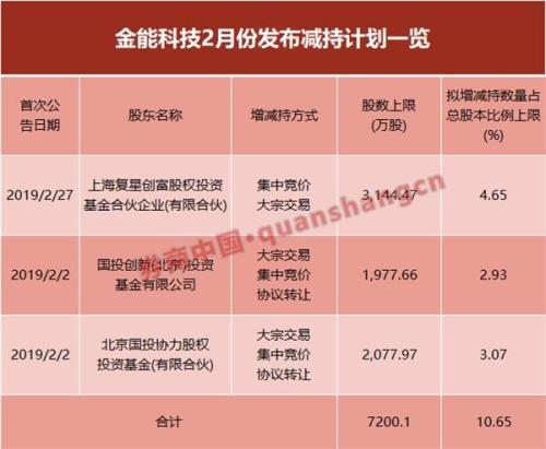 金能科技在2月份发布了两份减持计划,涉及三名股份,分别是上海复星创富股权投资基金合伙企业(有限合伙)、国投创新(北京)投资基金有限公司、北京国投协力股权投资基金(有限合伙),累计减持7200.1万股,占公司总股本的10.65%。