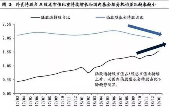 银河证券基金研究中心总经理胡立峰指出:截至2018年底的数据显示,外资与公募基金相比,A股持股市值只差3188.91亿元。如果2019年公募股基规模没有显著增长的话,则预计外资持股市值将快速追赶公募。