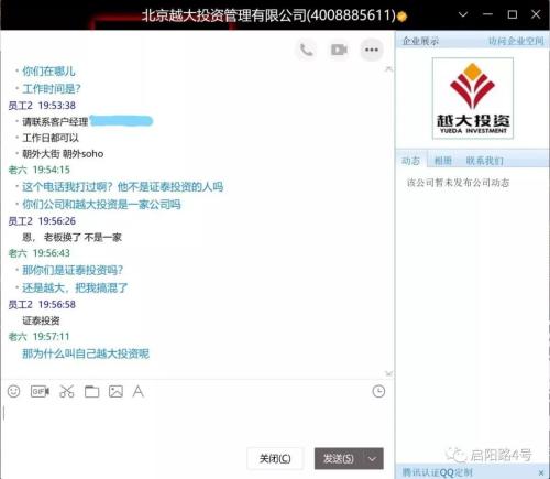 此后启阳路4号又就此询问李君辉,其解释,在证泰投资之前,他还在越大投资做了3年,是老员工,所以越大投资官网上留的是他的电话。而之所以会出现证泰投资顶替越大投资的情况,李君辉称是越大投资的老板转型去做私募,将公司这块业务连同办公室、人员转给了证泰投资,并称越大投资不会开发新的配资客户,只接待老客户。两家公司没有关系。