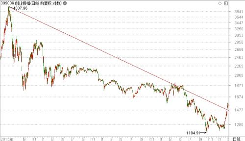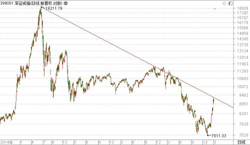 另外,看看目前的趋势,从普通坐标来看,目前沪指、深圳成指、中小板指均遇到了2015年牛市巅峰以来的长期压力线,目前处在这个压力区域之内。而创业板指已经突破了长期压力线。