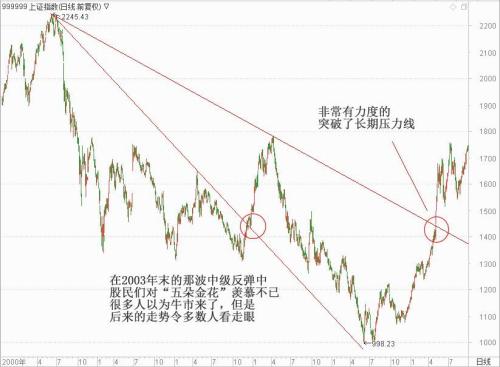 在2001年那次资金线见到历史底部之后,虽然市场处在熊市之中,但是局部行情也较多,如2002~2003年的汽车股行情(如长安汽车(000625,诊股)(000625)、一汽轿车(000800,诊股)(000800)等),2003年四季度到2004年2月,当时出现了“五朵金花”。记得当时,很多专业人士通过波浪理论研判大牛市来了。不过随后沪指从2004年4月7日的1783点跌到了2005年6月的998点,在这其中,也有不少优质股提前于沪指见到历史底部,如贵州茅台(600519,诊股)(600519)、万科A(000002,诊股)等。