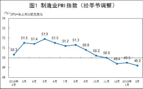 从近日公布的PMI数据来看,2019年2月份,中国制造业采购经理指数(PMI)为49.2%,比上月下降0.3个百分点。