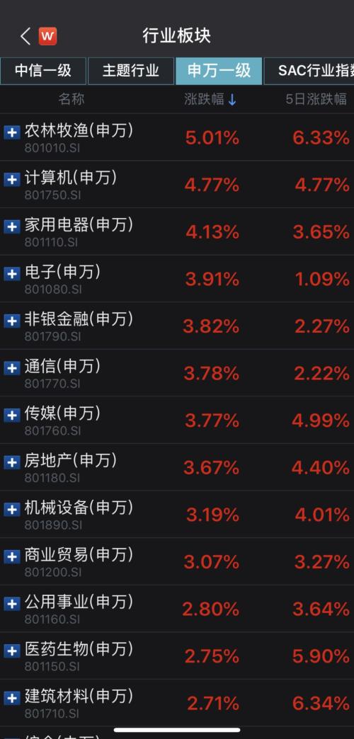 从盘面上来看,两市个股普涨,仅有40只个股下跌,涨停个股数超过百只。行业板块全线上涨,涨幅居前的农林牧渔、计算机、家用电器行业分别上涨5.01%、4.77%、4.13%,涨幅靠后的纺织服装、采掘、交通运输分别上涨1.86%、1.88%、1.89%。
