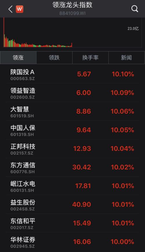 个股方面,前期领涨龙头今日爆发,陕国投A(000563,诊股)、领益智造(002600,诊股)、大智慧(601519,诊股)、中国人保(601319,诊股)、正邦科技(002157,诊股)、大智慧等多股涨停。东方通信(600776,诊股)再度涨停,半日成交额达到32.41亿元。