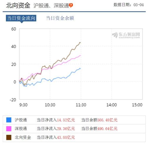 3月4日,北向资金继续净流入,半日净流入43.88亿元,其中沪股通净流入14.52亿元,深股通净流入29.36亿元,继续保持强劲流入态势。