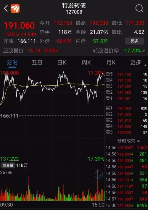 应该如何操作?该网友认为,假如在跌停板买入特发信息的话,除非收盘拉到红盘以上,隔天也不一定安全,一旦情绪再度回落,尾盘再度封死跌停也并非没有可能。这时候,便想到了转债。