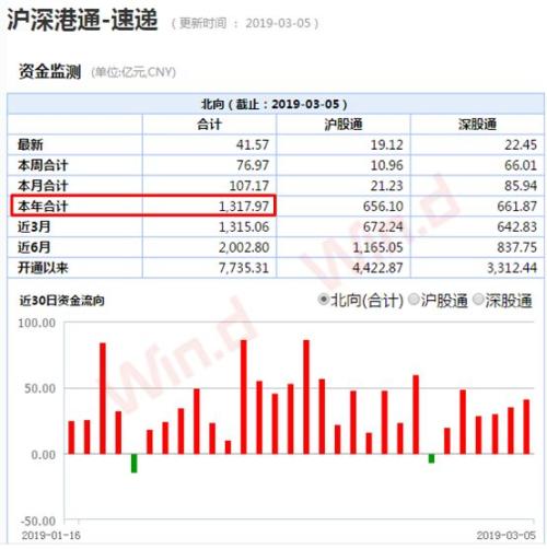 在市场一片“涨”声中,今年以来外资持续加仓。Wind数据显示,3月5日,北上资金再度净买入41.57亿元,2019年以来北上资金净流入A股金额已达1317.97亿元,超过上季度外资流入的总和。