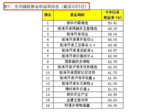 股市的赚钱效应在基金身上体现。截至3月5日,今年以来主动偏股基金的涨幅最高已经超过50%,16只主动偏股基金超过40%。