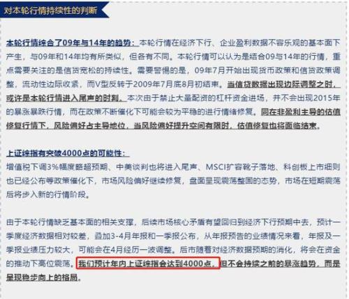 长城证券表示,由于本轮行情缺乏基本面的相关支撑,后续市场核心矛盾有望回归到经济下行预期中去,预计一季度经济数据相对较差,叠加3-4月年报和一季报公布,从年报预告的业绩情况来看,年报及一季报业绩压力较大,可能会在4月经历一波调整。后市随着对经济数据预期的消化,将会在资金的推动下高位震荡。我们预计年内上证综指会达到4000点,但不会持续之前的暴涨趋势,而是呈现稳步向上的格局。