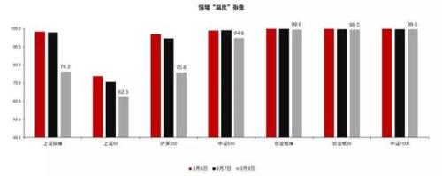 在春节开市前,中信策略分析师秦培景明确喊出上证综指有望冲击3000点,行情将持续至全国两会前后。昨日,中信策略认为,市场“温度”区间在0度~100度,正常的温度在43度左右。截至3月8日收盘,上证综指/上证50/沪深300/中证500/创业板指/创业板50/中证1000的“温度”分别达到76/62/76/95/100/100/100,中证500、创业板指、创业板50和中证1000在3月8日回调后仍处于亢奋状态;上证综指/上证50/沪深300已经有明显降温,其中上证50情绪温度回落至62度,进入正常区间;创业板指和中证1000的情绪“温度”仍处于历史最高位,甚至高于2015年上半年的水平。