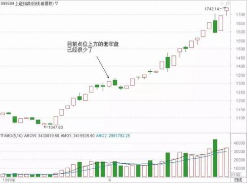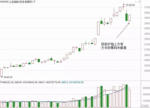 首先来看套牢盘情况,在1999年6月1日时,沪指上方的套牢盘很少了。而以上周四的高点来看,沪指上方还有大半的套牢盘存在,可见3000点上方压力巨大。如果确实想短期之内解套这些套牢盘,那么必须成交额要放大,如沪市成交额放大到8000亿元,甚至1万亿元以上。我们可以想一想,目前沪市的成交额有没有可能达到8000亿以上的水平?