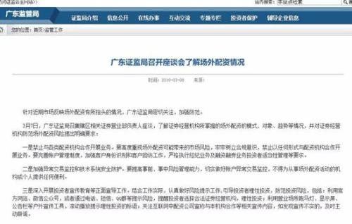 3月7日,广东证监局召集辖区相关证券营业部负责人座谈,了解证券经营机构所掌握的场外配资的模式、对象、趋势等情况,并对证券经营机构防范场外配资风险提出明确要求: