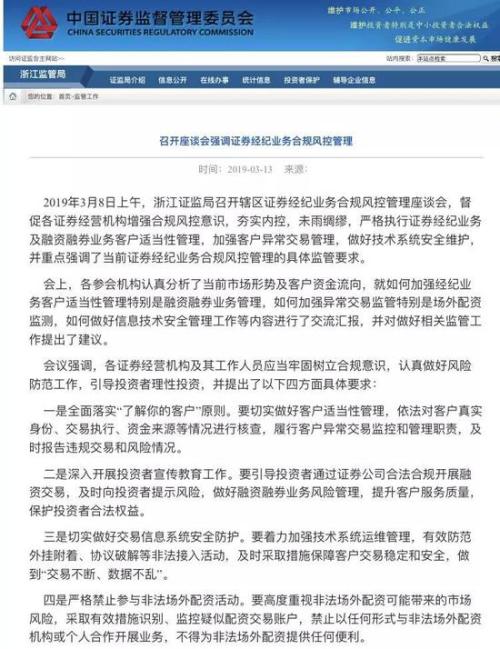 而3月13日消息,3月8日上午,浙江证监局召开辖区证券经纪业务合规风控管理座谈会,督促各证券经营机构增强合规风控意识,夯实内控,未雨绸缪,严格执行证券经纪业务及融资融券业务客户适当性管理,加强客户异常交易管理,做好技术系统安全维护,并重点强调了当前证券经纪业务合规风控管理的具体监管要求,并提出了以下四方面具体要求: