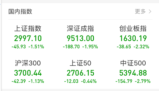 今日各大指数基本单边下行,上证指数大跌1.51%,失守3000点,报收2997.1点,跌45.93点;深证成指收跌1.95%,创业板指收跌2.32%。