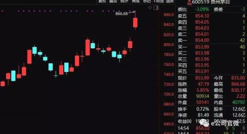 超预期的业绩引爆了茅台的股价。29日早盘跳空高开3.45%以846元开盘,震荡一路走高,截至收盘股价高达853.99元,涨幅5.85%。股价盘中再创历史新高。全天成交额高达73亿元。