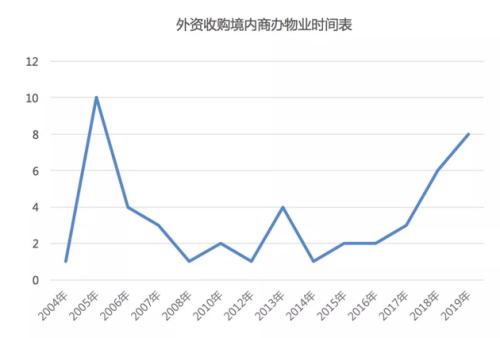 2006年起,政府出台了一系列“限制外资炒房”规定,被收购物业数量直线下降。2015年,随着“限外令”的正式松绑,外资对境内物业的收购数量又开始呈现上升的趋势。2019年至今,外资在境内收购的商业地产已达8宗。