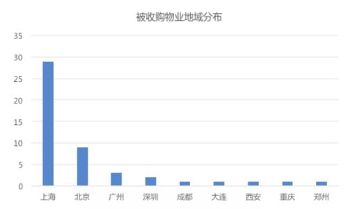 (2)从地域分布来看,被收购物业主要集中在北上广深这四大一线城市,占比接近9成。上海被收购的物业宗数最多,高达29起,占据半壁江山。北京被收购标的数位列第二,这与北京“五环内禁止新建酒店、写字楼”的指导政策密不可分。