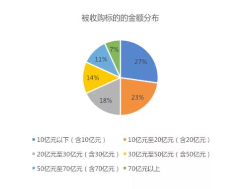 (4)从并购金额来看,有一半的标的并购金额是在20亿元以下,有8成以上的标的并购金额是在50亿元以下,只有极少数标的并购金额超过70亿元。
