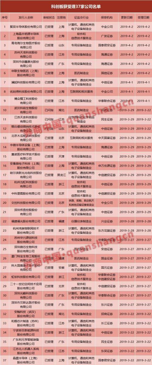 在首批企业3月22日获得科创板受理后,科创板发行上市审核的“项目动态”板块迅速扩容。至4月2日,已有六批共计37家企业在名单之中。