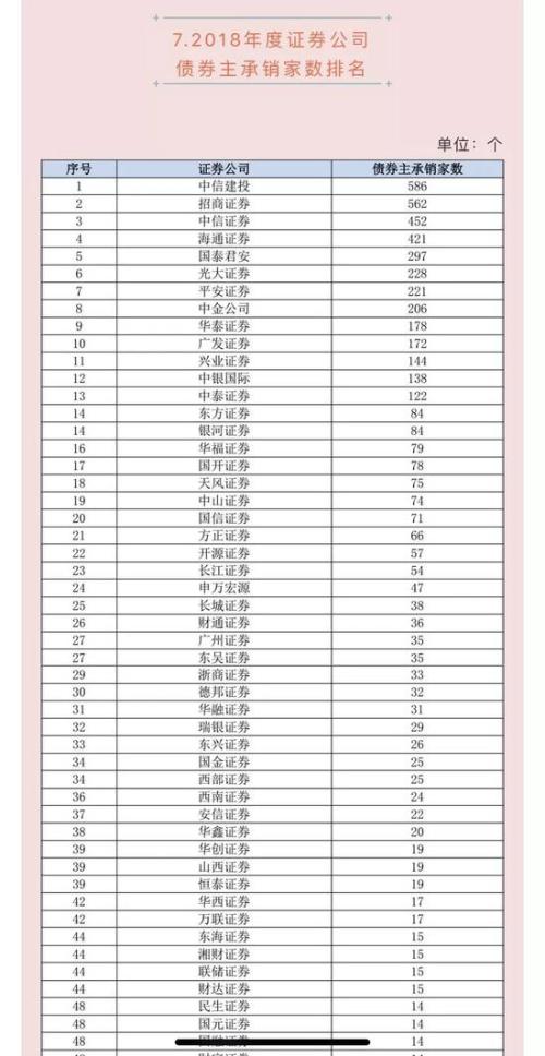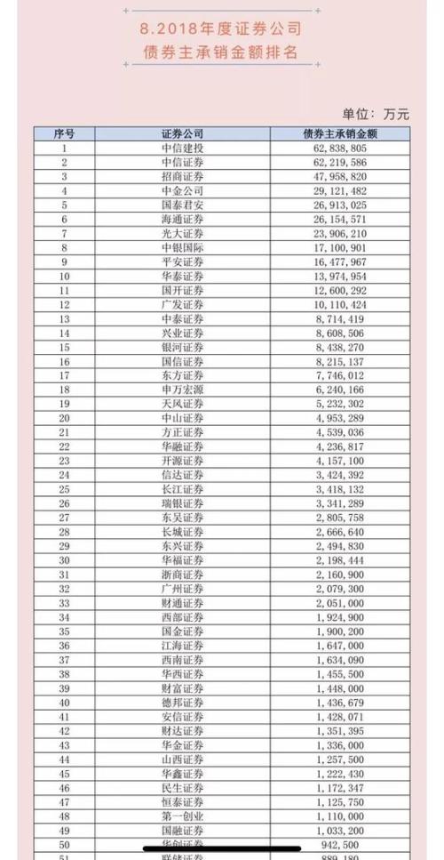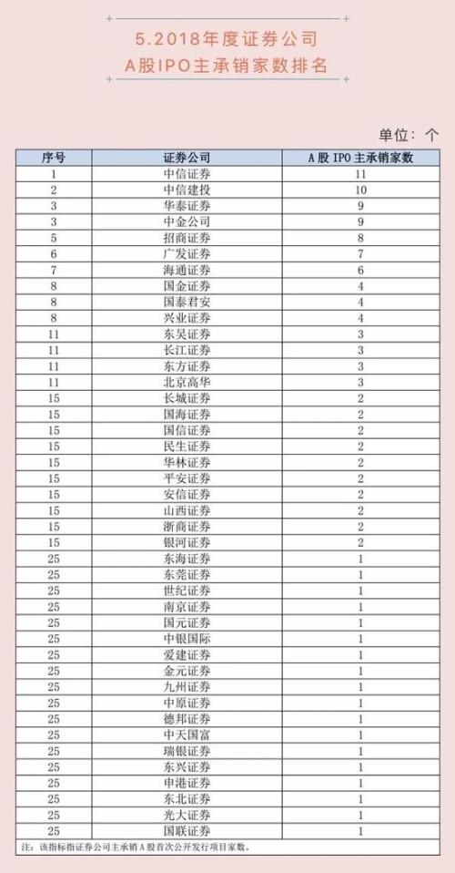 此次公布的年度证券承销业务“成绩单”包括了2018年证券公司股票主承销家数及金额排名、债券主承销家数及金额排名,以及各子项目的具体排名情况。