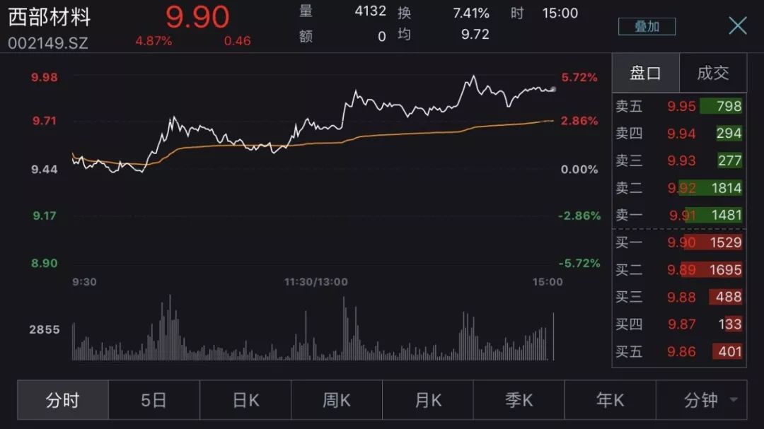 西部材料股价今天应声上涨,收盘涨幅4.87%,报9.9元/股。