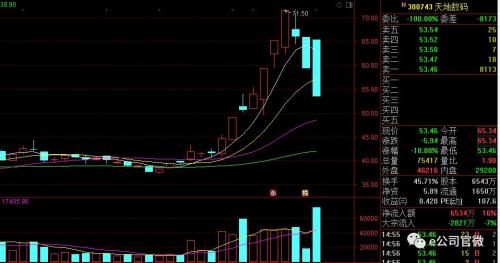 截至收盘,天地数码报收53.46元,全天放量跌停,换手45.71%,成交总额4.20亿元。