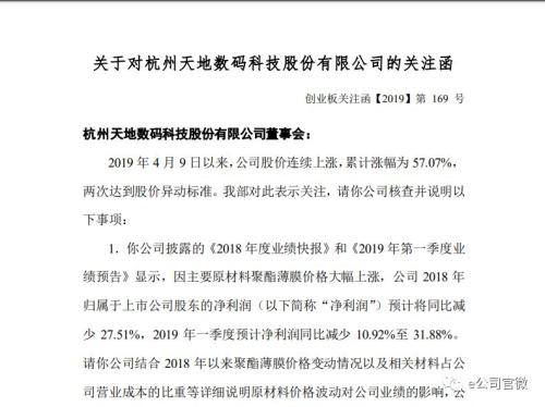 此外,4月16日晚间,深交所创业板公司管理部还向天地数码下发《关注函》,要求公司结合2018年以来薄膜价格变动情况,以及相关材料占公司营业成本的比重等,详细说明原材料价格波动对公司业绩的影响,并说明公司基本面是否发生变化。