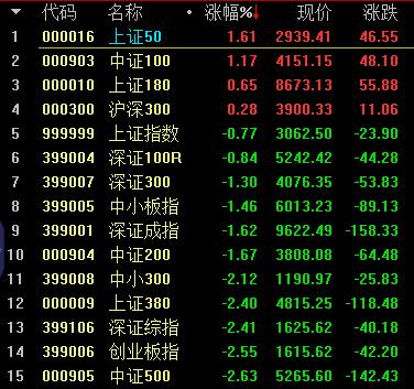 上证50、中证100、上证180、沪深300等主要权重指数全线收红,而创业板指、中证500指数则再度下挫逾2%。
