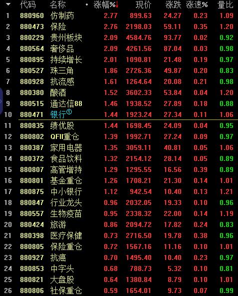 值得注意的是,今日二八跷跷板效应明显。“喝酒”、“吃药”、“买家电”,以及银行、保险则成为了资金避风港。