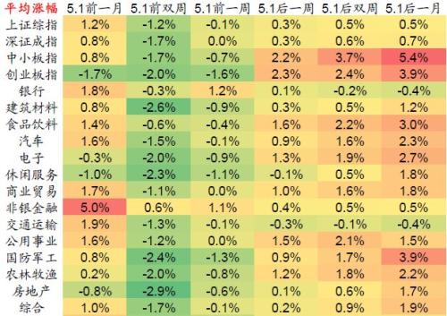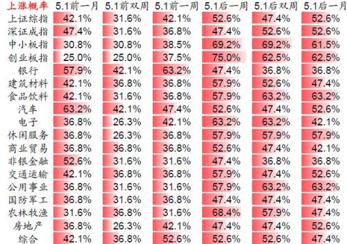 广发证券(000776,诊股)研报显示,从2000年至2018年的合计19个五一长假情况分析,五一之后第一周和第二周,上证综指的上涨概率分别为52.6%和47.4%,整体涨跌偏向性并不明显。