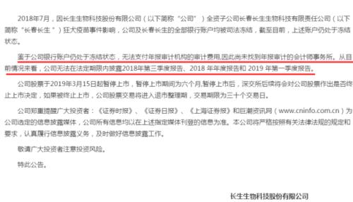 *ST长生正是去年闹得沸沸扬扬的假疫苗案事主,案发后公司全部银行账户都被司法冻结。其在公告中表示,鉴于公司银行账户仍处于冻结状态,无法支付年报审计机构的审计费用,因此尚未找到年报审计的会计师事务所。从目前情况来看,公司无法在法定期限内披露2018年第三季度报告、2018 年年度报告和 2019 年第一季度报告。