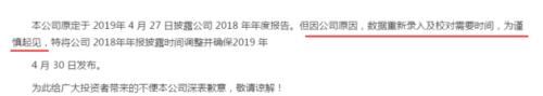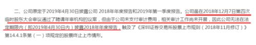 *ST新亿原本在4月27日的公告中称,将于4月30日披露年报,但最终也并未发布。其在4月27日的公告中称,因公司原因,数据重新录入及校对需要时间,为谨慎起见,特将公司2018年年报披露时间调整并确保2019年4月30日发布。