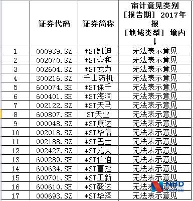 2017年被出具“无法表示意见”审计报告的上市公司则是17家。
