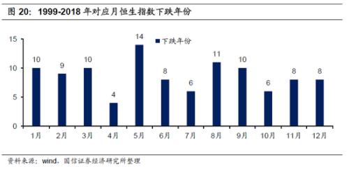 从对应月涨跌年份统计来看,在5月份,20年中有年中有14年次下跌,其是8月,11年次下跌;反之 4月份、7月份、10月份,分别只有4年次、 6年次、6年次下跌。 两者综合来看,投资港股不要错过 4、7、10月,规避 5、8月。