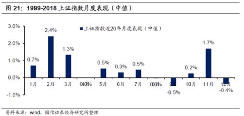 1999-2018年,A股上证指数5月表现处在一年的平均水平,月度涨幅为0.5%,2月是表现最好的份,度涨幅2.4%,其次是11月,涨幅为1.7%,再次是3月,涨幅为 1.3 %。需要规避的是9月,跌幅 0.5%,12月,跌幅 0.4% 。
