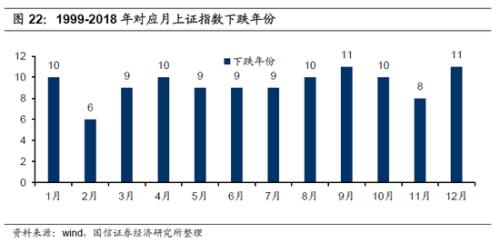从对应月涨跌年份统计来看,在5月份,20年中仅9年次下跌,而9月与11月均有11年次下跌;反之,2月份、8月份,分别只有6年次、8年次下跌。两者综合来看,投资A股不要错过2、3、11月,规避9、12月。
