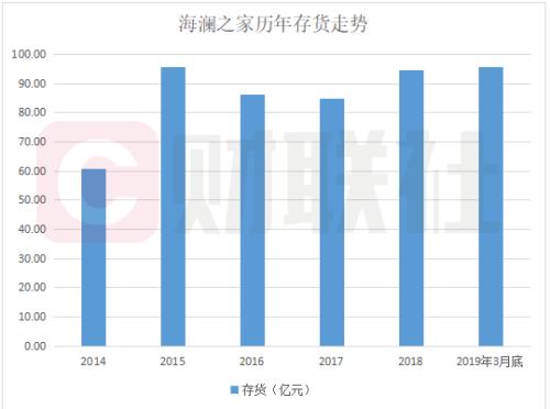 不只是业绩低迷,海澜之家还面临着资产质量下滑的局面。2014年时,海澜之家的存货为60.86亿,而到2019年3月底,这一数字上升到了95.4亿;截止今年3月底,存货占公司净资产的比重已高达67.3%。下图为财联社根据财报绘制的海澜之家历年存货走势: