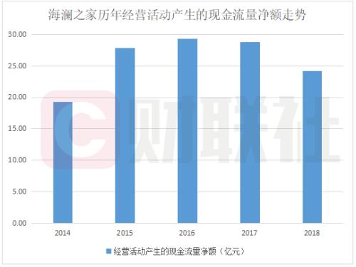 除了资产质量外,海澜之家的现金流也在逐步趋紧。据财报,2018年,公司经营活动产生的现金流净额为24.19亿,同比下跌15.98%;事实上,2017年时,其经营活动产生产生的现金流净额就出现了下跌,跌幅为1.64%。下图为财联社根据财报绘制的海澜之家历年经营活动产生的现金流量净额走势: