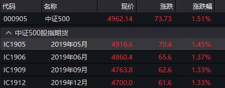 股指期货各合约亦悉数上涨,截至中午收盘,主力合约IF1905、IH1905双双涨逾1.5%,分别收报3657.4点、2753.2点;IC1905上涨1.45%,收报4916.6点。