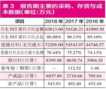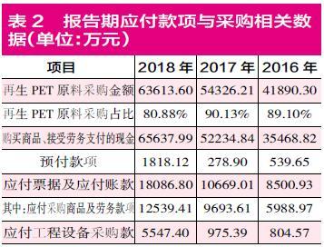 2018年,优彩资源对再生PET原料的采购金额为63613.60万元,占当期采购总额的80.88%(如表2),由此可合理推算出2018年采购总额有78651.83万元。考虑2018年5月1日起增值税税率有所下调,按月均采购额计算,前四个月税率为17%而后八个月税率为16%,则推算出全年含税采购总额大约有91498.30万元。
