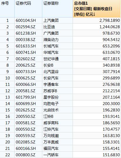 目前汽车股中,市值前三名的是上汽集团(600104,诊股)、比亚迪(002594,诊股)和广汽集团,扣除潍柴动力(000338,诊股)后,还有长城汽车市值比较高。