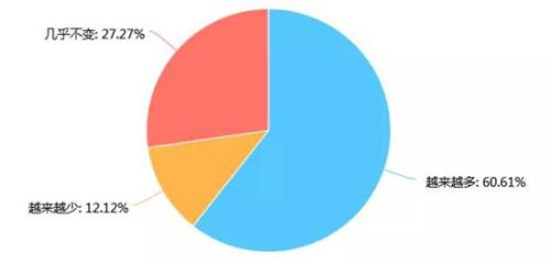 需要说明的是,虽然近年来不少券商对网金业务进行了大刀阔斧的改革,但网金业务获得的投入却并未因此削减。高达61%的受访者认为,近年来,公司对网金业务的投入实际上是越来越多的,另有27%的受访者表示,这一投入与过去并无明显不同,仅有12%的受访者表示公司削减了对网金业务的投入支持。