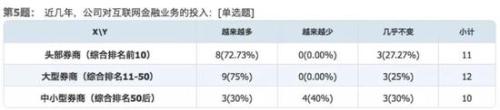 事实上,头部和大型券商对网金业务的重视程度尤甚。例如,国泰君安(601211,诊股)证券透露,公司高度重视对科技的战略性投入,2018年公司在信息技术方面投入10.51亿元,约为上一年度营收的6.08%。数据显示,在来自头部券商、大型券商的受访者中,认为公司对网金业务投入增加的,占比分别高达73%和75%,其余受访者也均表示这项投入并未受到削减。而在中小型券商中,情况却大不相同,仅有30%的受访者表示网金业务投入是增加的,另有40%的受访者表示公司对网金业务的投入正越来越少。