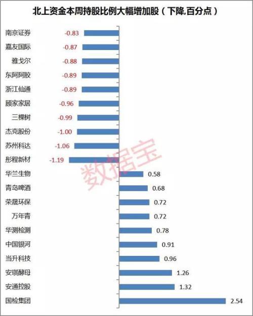 整体来看,本周北上资金增仓股数量大幅上升,共计755只。增仓比例超1个百分点的有国检集团(603060,诊股)、安通控股(600179,诊股)(维权)及安琪酵母(600298,诊股)。其中主营建筑材料、建筑装饰的国检集团本周获北上资金加仓最为显著,由上周的5.74%增至8.28%,获加仓2.54个百分点。当升科技(300073,诊股)、中国银河(601881,诊股)、华测检测(300012,诊股)等19股获加仓超0.5个百分点。