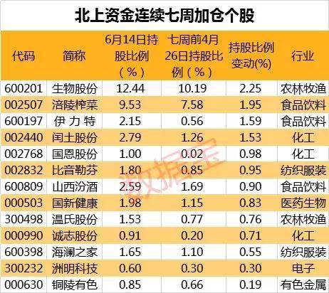 更进一步来看,以上118股中有13股连续七周获北上资金加仓。具体来看,生物股份(600201,诊股)持股比例增加显著,北上资金最新持股比例较七周前增加2.25个百分点,该公司禽流感动物疫苗的综合研究和生产能力居国内领先水平,或因非洲猪瘟疫影响,该股近来持续获北上资金加仓。居其后的是2只食品饮料股,分别为涪陵榨菜(002507,诊股)及伊力特(600197,诊股),北上资金持股比例较七周前分别增加1.95及1.59个百分点。化工股润土股份、国恩股份(002768,诊股)较七周前持股比例均增超1个百分点。