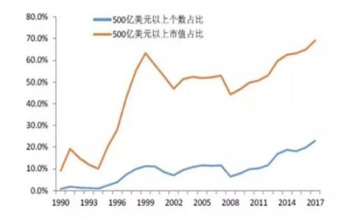 从1987年至2017年,美国市值超过500亿美元以上的公司市值占比从原先的10%上升到了近70%,而且这些公司的数量占比从过去的1%左右,提高到了20%以上。