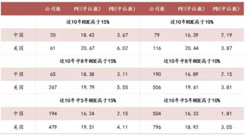 比较A股和美股股市过去10年中ROE有5年在10%以上的公司估值水平,发现国内约有504家符合条件,其市盈率中位数16.33,低于美国符合该条件上市公司的18.92。说明A股中业绩相对好的公司的估值水平比美国类似公司仍要低。