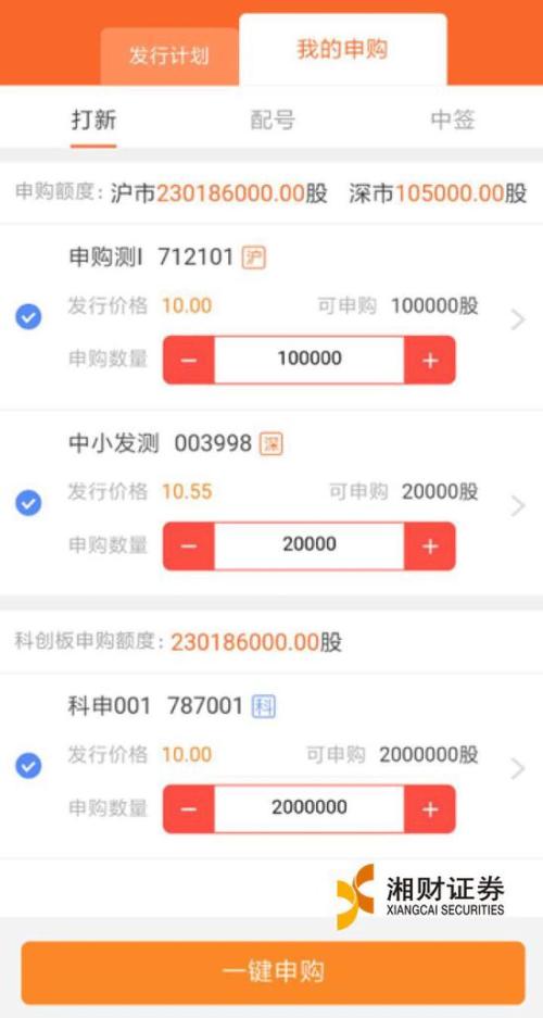 图为湘财证券“百宝箱”app科创板新股申购模拟界面,预计7月上线,申购额度非现实账户情况
