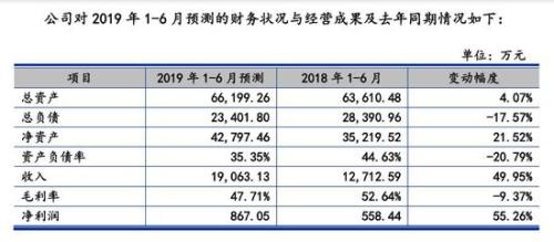 公司预测,2019年1-6月,公司收入为1.91亿元,较上年同期增加49.95%,保持持续增长;公司毛利率为47.71%,与2017年度、2018年度毛利率47.94%和49.25%基本持平,略低于2018年1-6月毛利率52.64%,主要原因系业务结构变化;公司净利润为867.05 万元,较上年同期增加55.26%。资产负债率为 35.35%,较上年同期下降20.79%。